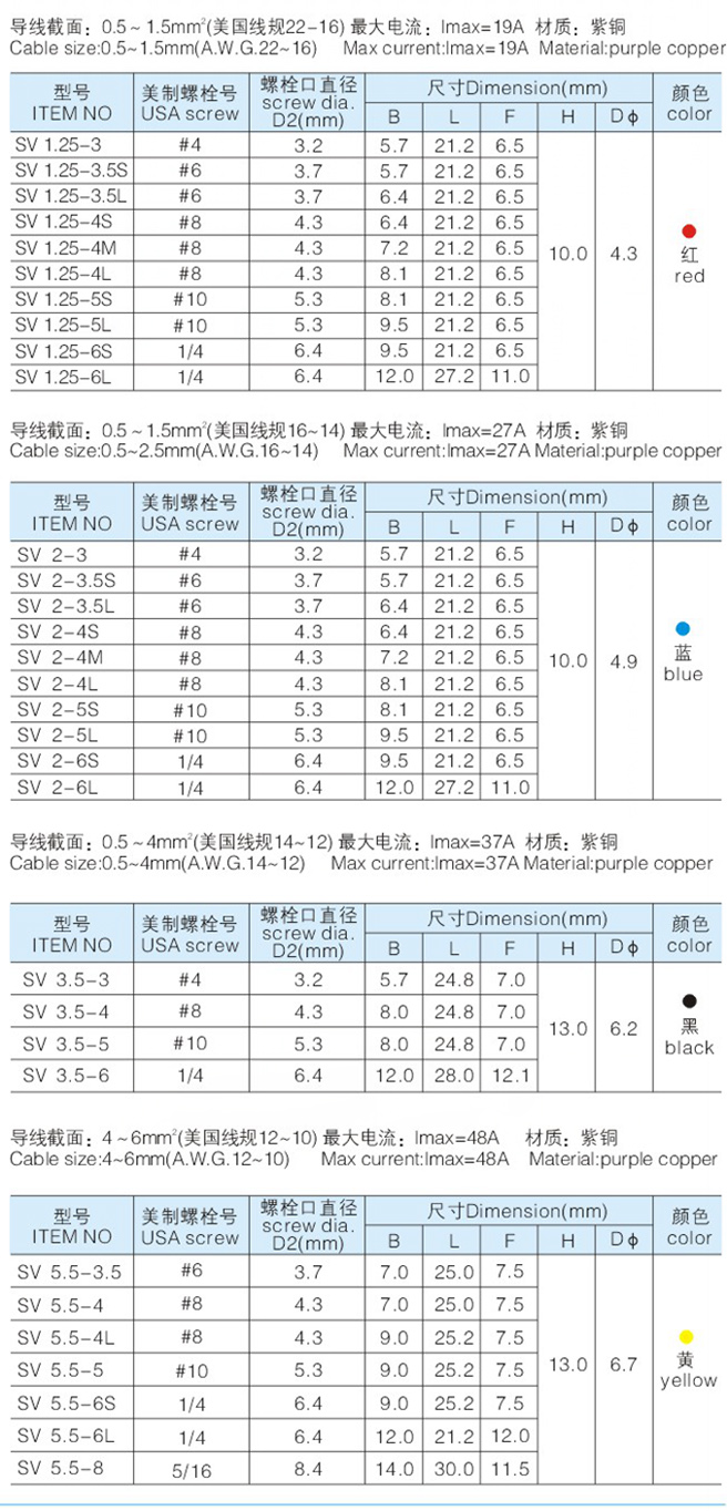 特征及用途:本產品系列端頭均據有關標準開發制造,可根據用戶需要鍍錫或鍍銀。 以及自由選用同規格大,中,小號。 端頭尾部尾縫焊銀,壓線內孔制有螺紋線, 預絕緣端頭的絕緣套為阻燃硬質量PVC材料,按有關標準通用顏色分等。 適用于:電控配電,繼電保護,電力電子和機床電器等成套設備,作為電連接接線線端 冷壓接的端頭產品。