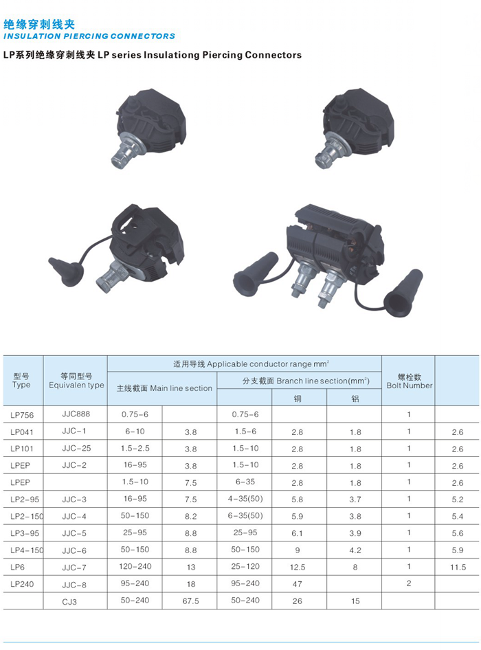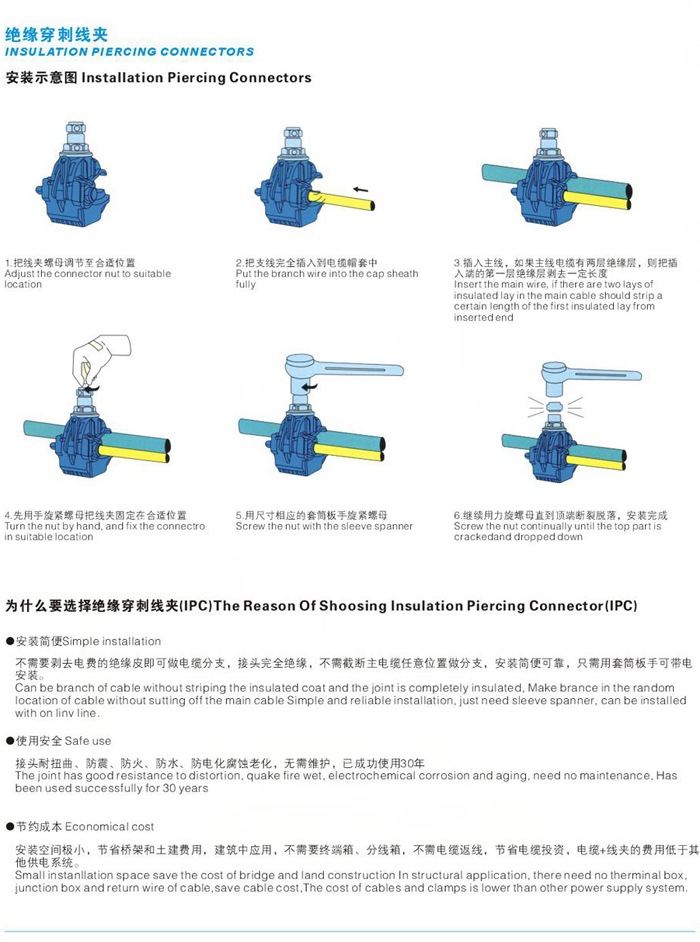 絕緣穿刺線夾,絕緣性能好。使用了特殊絕緣殼體,能抗光照及環境老化,有較高的絕緣強度。一定條件下,適應帶電作業。