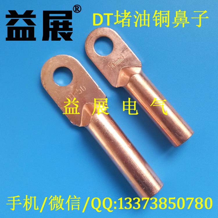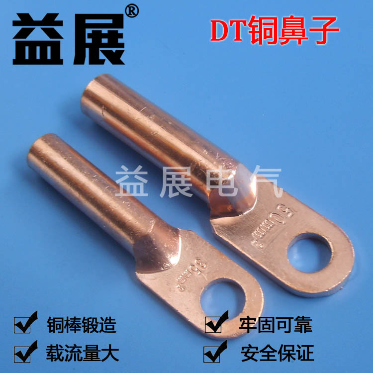 銅鼻子又稱銅管鼻,是用于電線電纜連接到電器設備上的連接件, 材質一般為T2紫銅車制,也有黃銅的, 產品外貌為鍋鏟圓頭, 頂端這邊為固定上螺絲邊,末端為上剝皮后的電線電纜銅芯,品種分為堵油式和管壓式,堵油式較好,為了抵御空氣氧化,又有鍍錫即在銅鼻子表面鍍上一層錫,用以防止其氧化,變黑,大于10平方的才使用銅鼻子,小于10平方的電線不使用銅鼻子,改用冷壓線鼻。銅鼻子有表面鍍錫和不鍍錫管壓式堵油式之分。 DT銅鍍錫接線端子就是在原來DT銅接線端子的基礎上,在表層鍍上一層"錫",增強DT銅端子的導電能力。